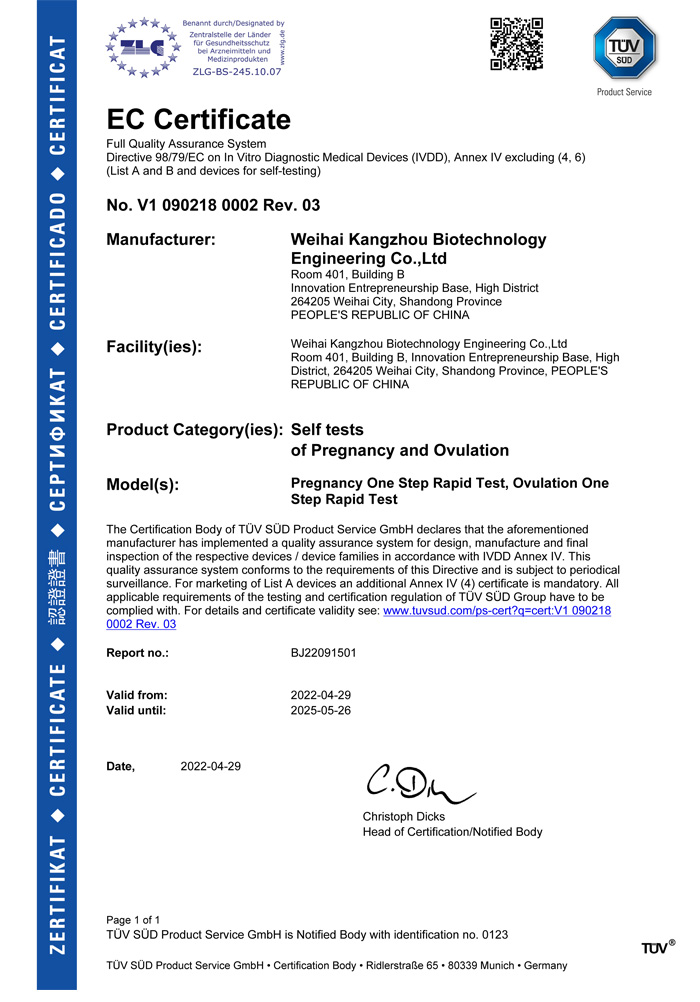 ? ? ?威海康州生物工程有限公司成立于2013年,公司坐落于風景秀麗的海濱小城——威海市??抵萆锸羌邪l、生產和銷售于一體的生物科技公司,與威海哈爾濱工業大學合作研發團隊,擁有先進的科研基地及生產基地。主要從事快速診斷檢測產品的研發、生產、銷售。產品涵蓋:生育檢測、藥物濫用檢測、農藥殘留檢測以及其他臨床診斷檢測等。公司自主研發生產得早早孕試紙,排卵檢測試紙,毒品檢測及疾病檢測等醫用產品,經過歐盟認證,產品質量穩定,值得信賴。